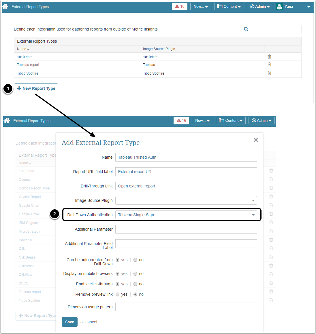 NOTE: If you already have an existing External Report Type defined for Tableau, you can enable authentication for all reports associated with this type by modifying the Drill Down Authentication setting to Tableau Single-Sign.