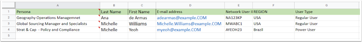- Region: The region the User is working from (if applicable). If features, functions, and content are subdivided, add columns for the purposes of validation.
