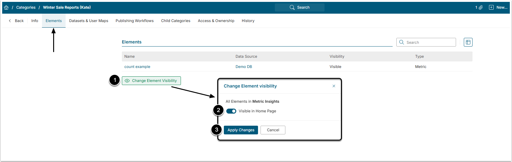 - Activate the toggle switch to make all Elements of the category visible on the Homepage;