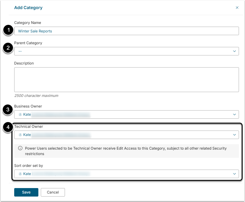 - Business Owner: Select the Business Owner of the Category, who may be any User. The difference between Business and technical Owners is describes in this article;