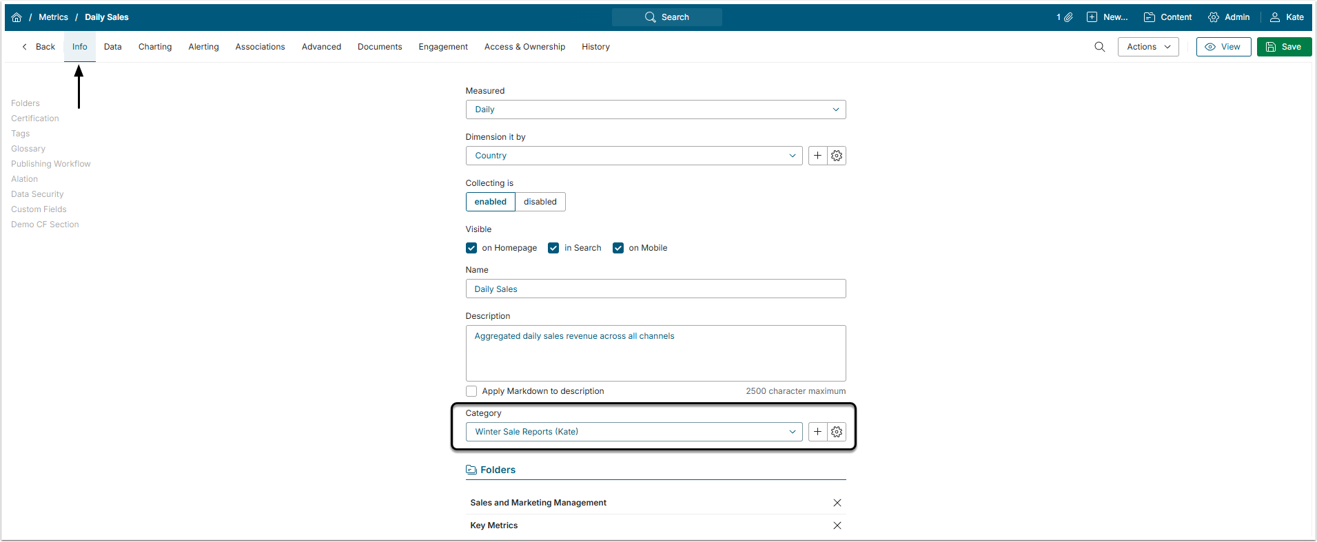On the Info tab, find the Category field and select the Category from the drop-down menu. Don't forget to [Save] the changes.