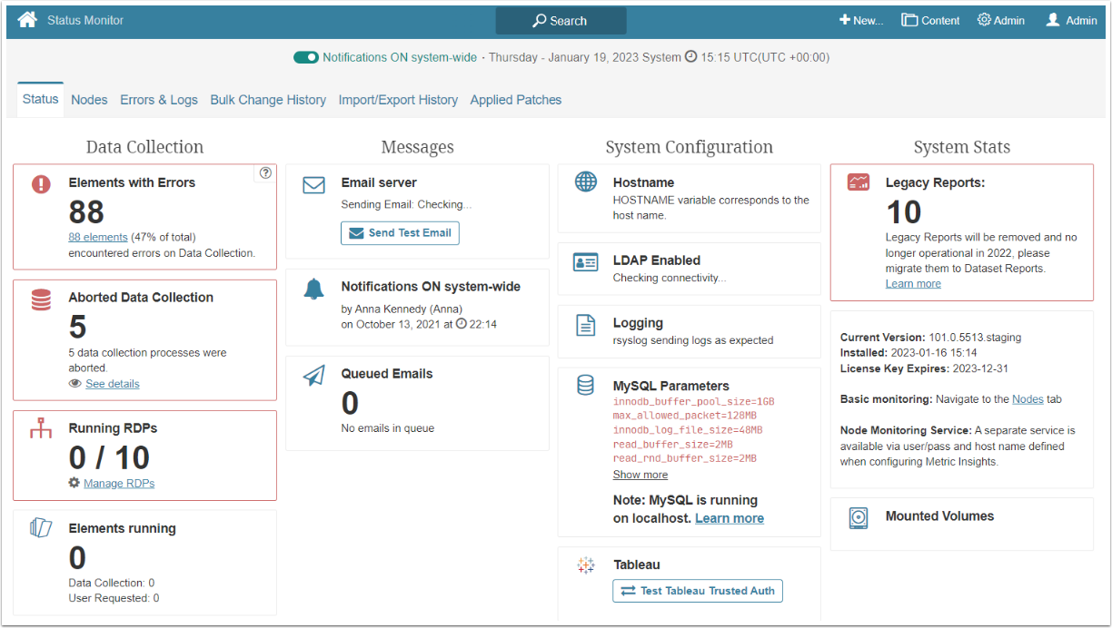 The Status Monitor screen provides details on how the Metric Insights system is functioning.