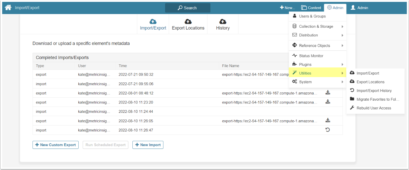 Import/Export, Export Locations and Import/Export History options open a list of existing processes, export locations and history log. Migrate Favorites to Folders and Rebuild User Access options lead to separate windows.