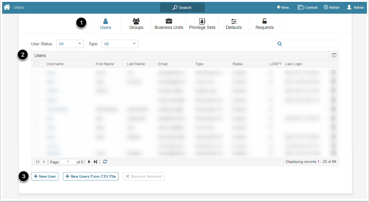- This tabs contain lists of existing Users, Groups, Business Units, Privilege Sets, Defaults and Requests