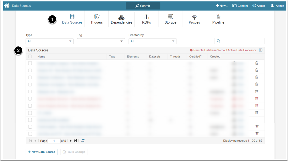 - This tabs contain lists of existing Data Sources, Data Collection Triggers, Data Dependencies, Remote Data Processors, Data Storages, Proxies and Pipeline