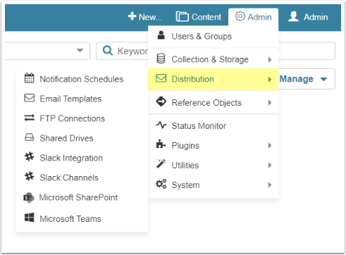 Notification Schedules, Email Templates, FPT Connections, Shared Drives and Microsoft SharePoint menu options open lists of existing items, where Admin can add new ones. Slack Integration, Slack Channels and Microsoft Teams options lead to the Editor windows.