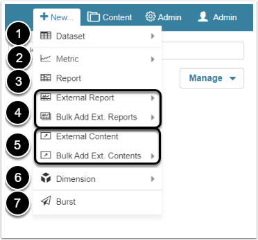 - Elements: Metrics, Multi-Metrics, Reports, External Reports
