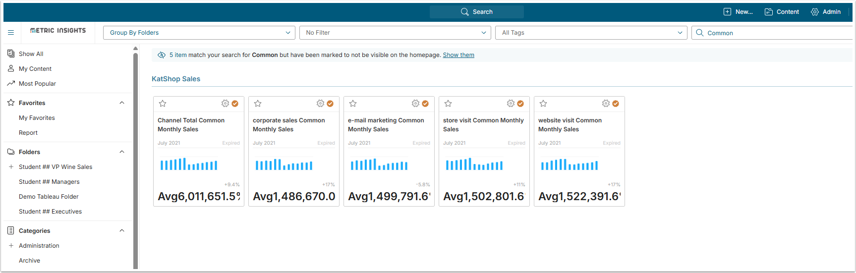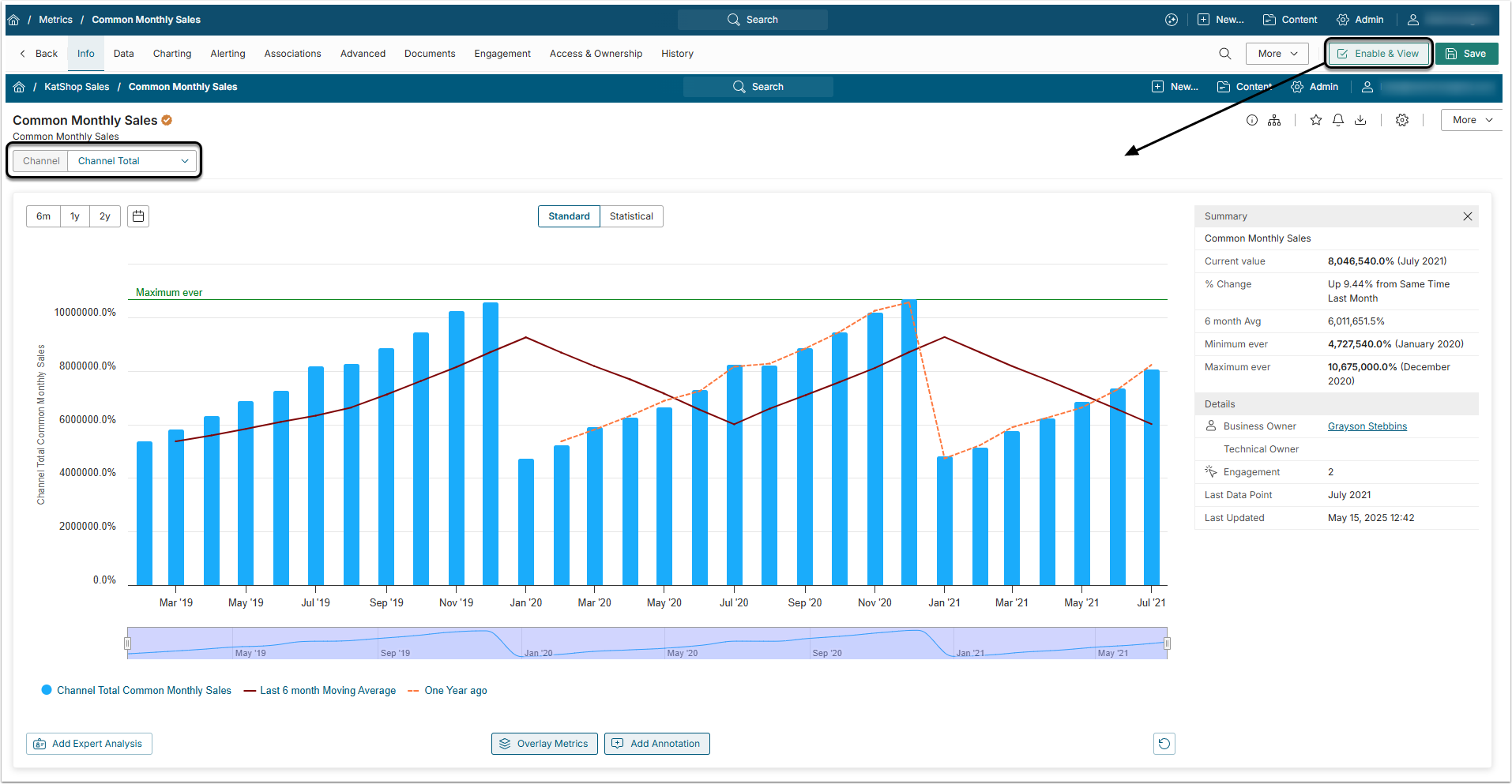 Dimensioned Metrics should be used when you want to show a given Measure charted over time with a Dimension drop-down list. In this example, you'll see the process of building a Dimensioned Monthly Metric that measures sales by Sales Channel. This example uses the Metric Editor to build the new Metric in order to have access to advanced options.