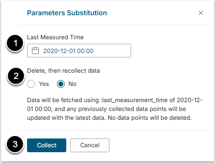 - Delete, then recollect data: Define if the previously collected data should be deleted or just updated.