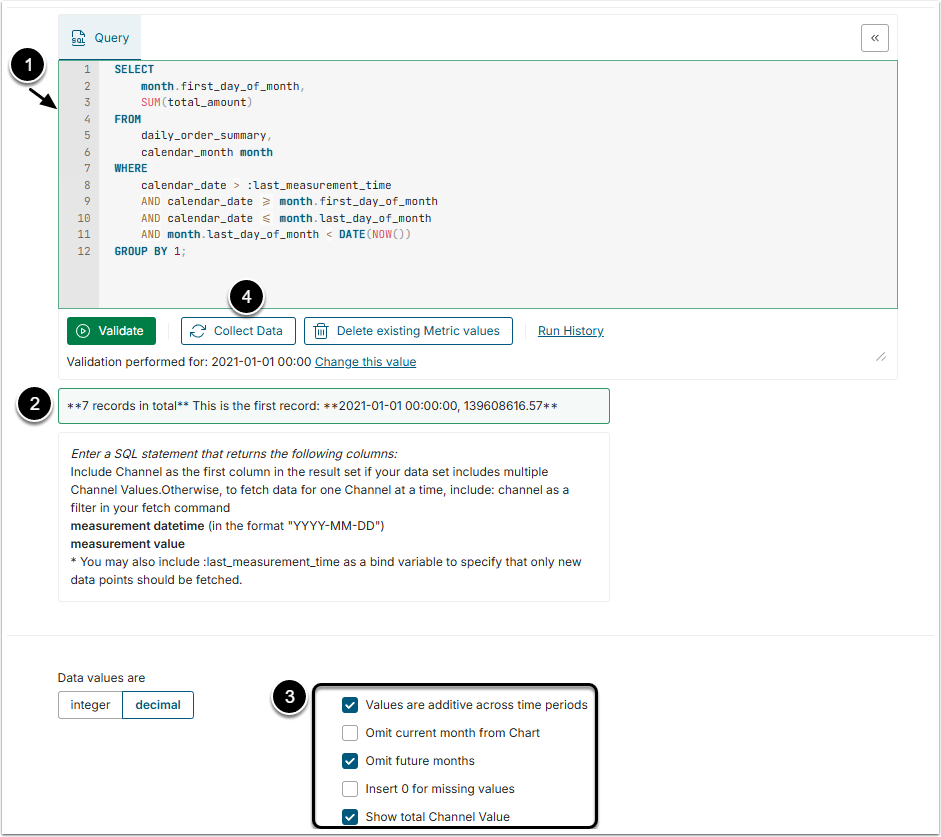 Query: Enter an SQL query. - For more details, see Write a SQL Statement for a Dimensioned Metric article.