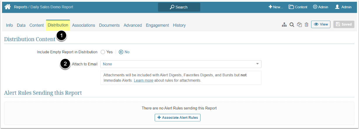 Access Content > Elements, find the Report you want to attach as a file and click its Active Name Link to open the Report Editor.