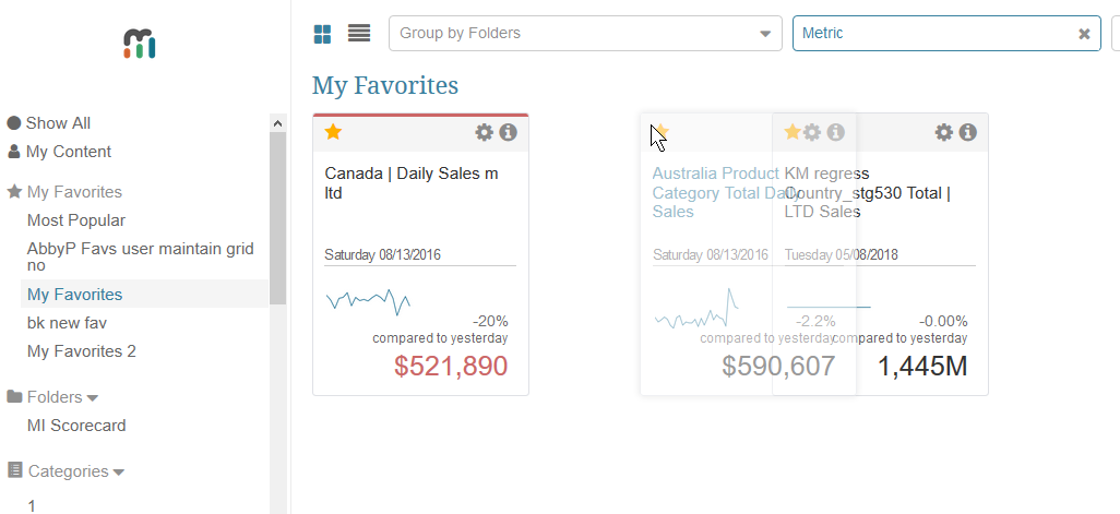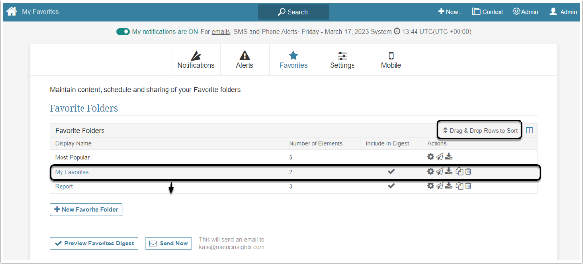 You can reorder the elements belonging to a Favorites folder by dragging and dropping them in the right-hand panel of the Homepage. The order set on the Homepage will be used in the email.