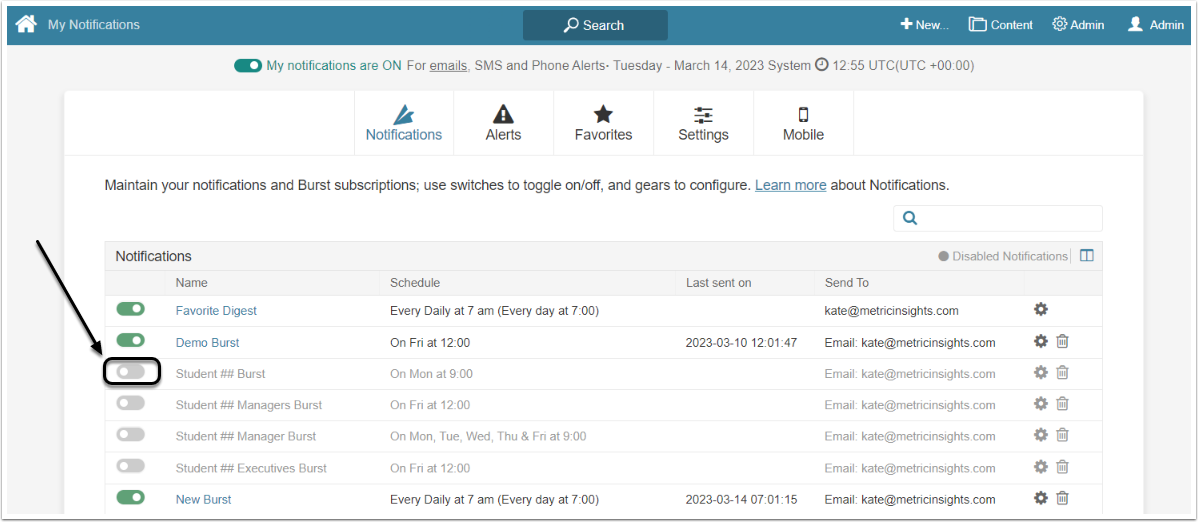 - The Notifications table displays all of your subscriptions, their delivery schedule, email address they are sent to and the last sent date/time- To subscribe/unsubscribe from receiving notifications toggle, them on or off. These preferences will be automatically saved