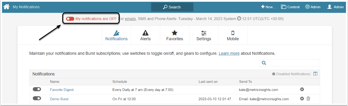 In the Notifications Editor, you can customize a number of essential features of Metric Insights, such as Alerts, Favorites, Bursts, Schedules, and your Personal Preferences.