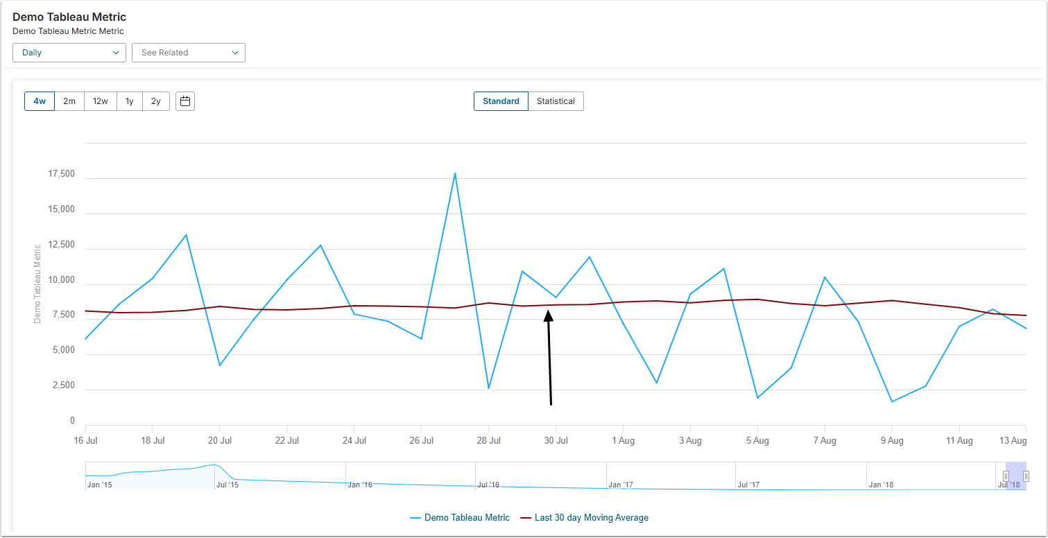 Using a Moving Average feature allows you to smooth out volatility in a Metric so that the User can see a smoother trend-line for the data. A Moving Average is computed over a preset interval (for example 30 days) for all points included in a chart. This article describes how to add a Moving Average Line to the Metric Chart.
