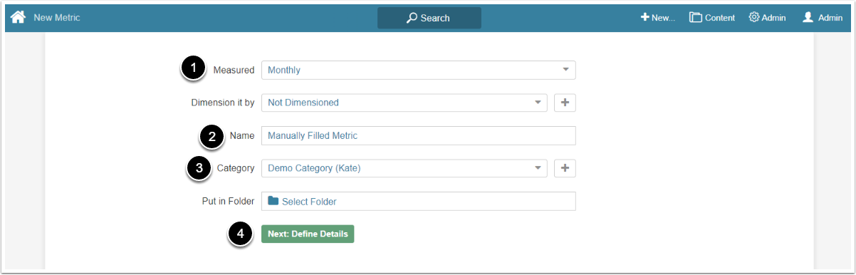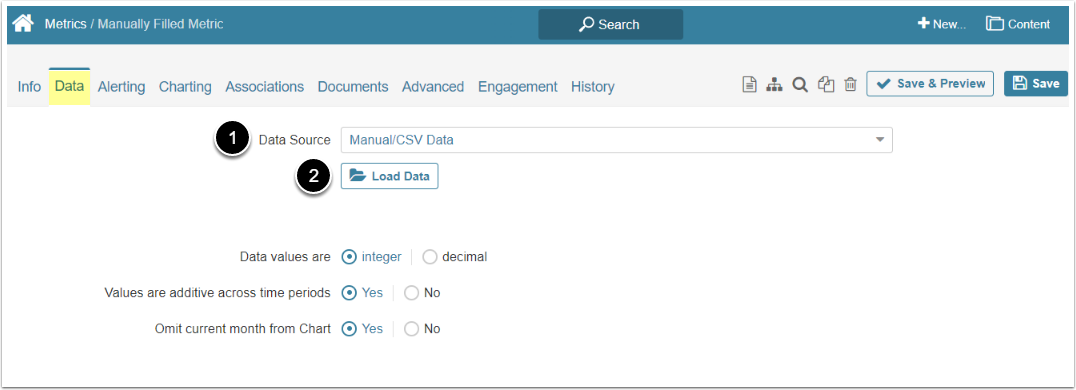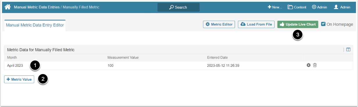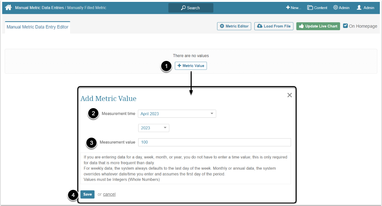 In Metric Insights it is possible to enter data to a Metric manually, one value at a time. This article describes how to manually add data to the Metric to populate it completely or just to correct the data uploaded via CSV file.