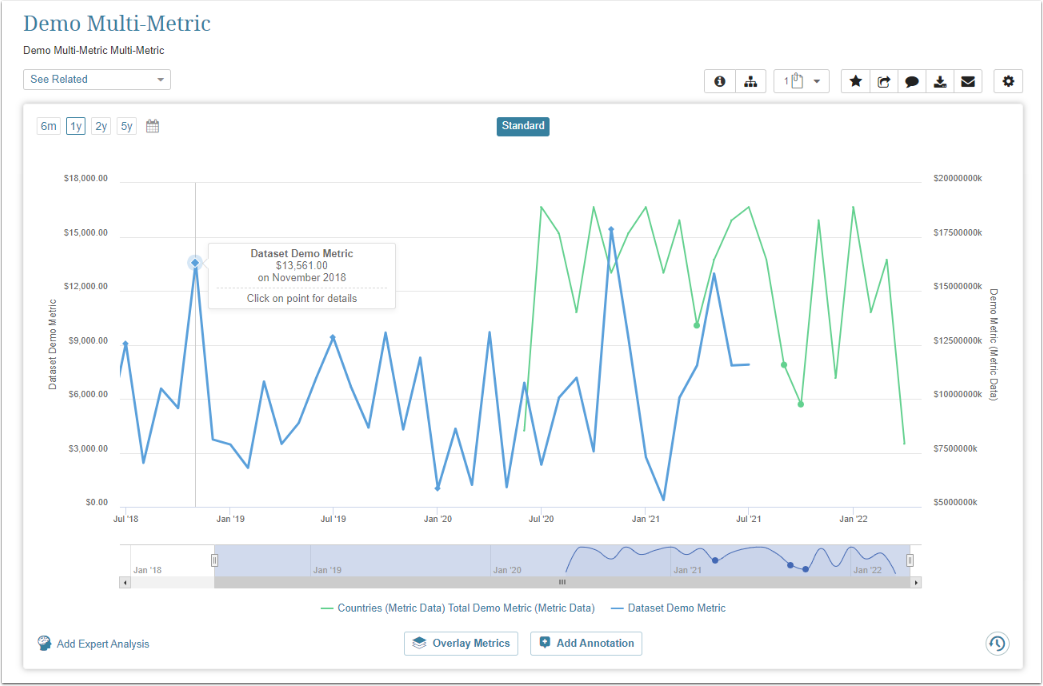 This article describes how to create a simple Multi-Metric. Multi-Metrics provide the ability to quickly combine multiple existing Metrics into the same chart. Individual Metrics can be drawn against one or two axises and can be shown as a combination of Bars and Lines.