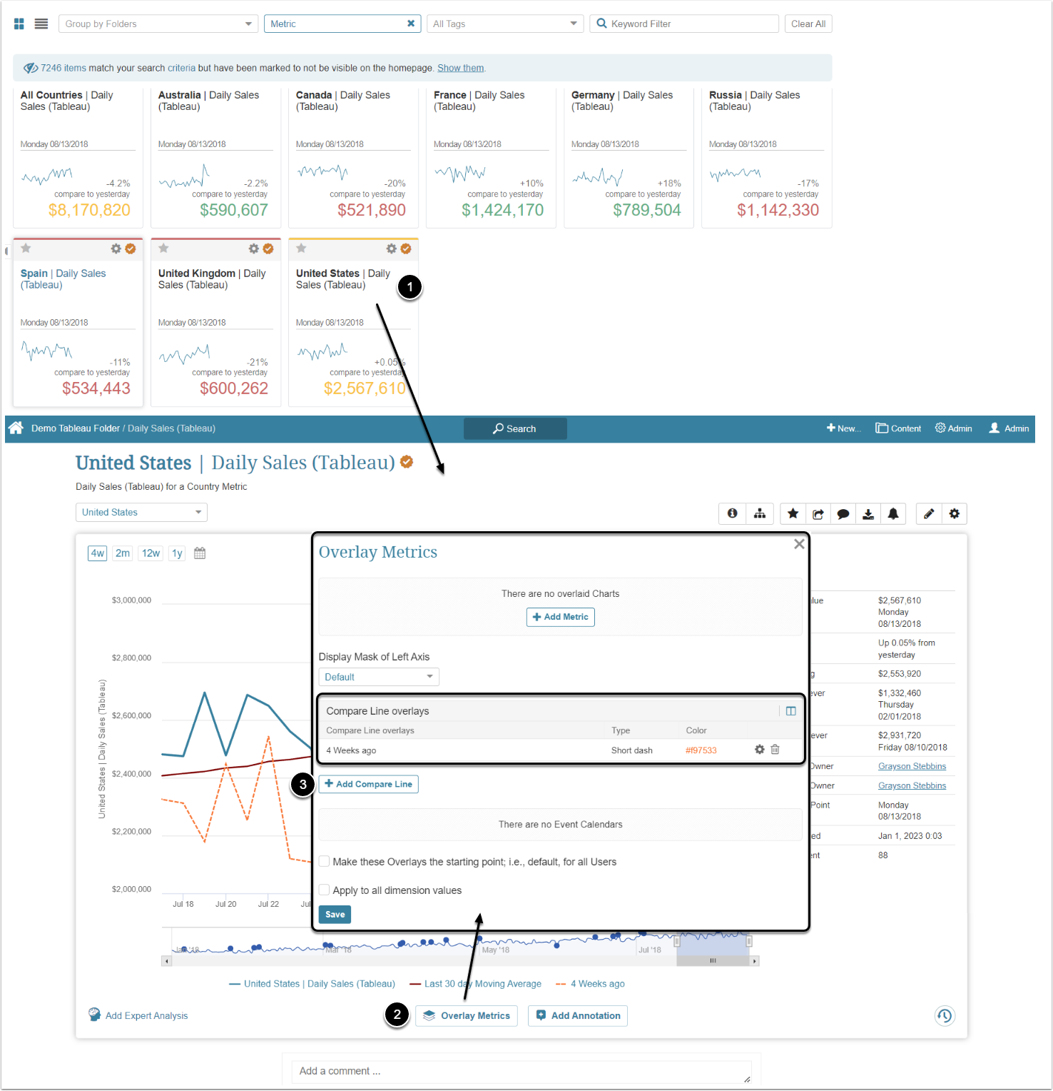 Compare Lines are associated with the settings of Measurement Intervals. For example, the settings defined for the Daily Measurement Interval influence all existing and new Daily Metrics differently. This article covers the basic settings for Compare Lines, which can be added to the existing Charts or will appear as defaults on all newly created Metrics.