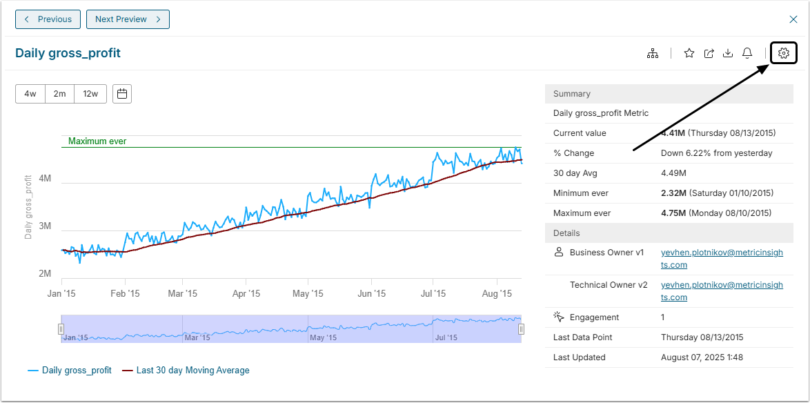 - After activating the Make Discoverable to Users Without Access toggle, the Metric will becomes visible to Users even if they don't have an access to it. Choose the Preview image here. Also it is possible to add an email to which all the access requests will be received. For more details, refer to Setting Element's Discoverability article.