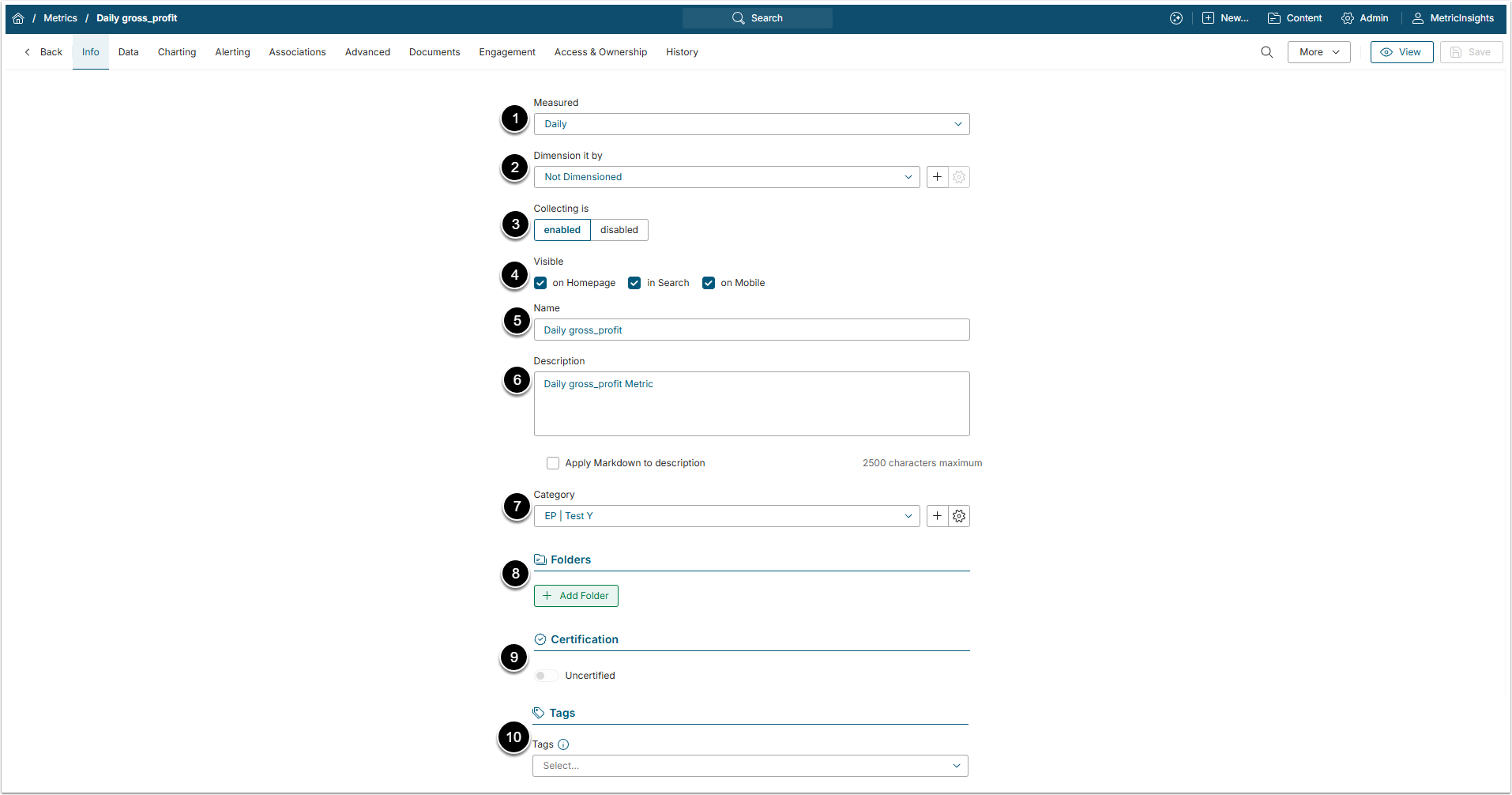 - Folders: Add the Metric to the the Folder by clicking [+ Add Folder].