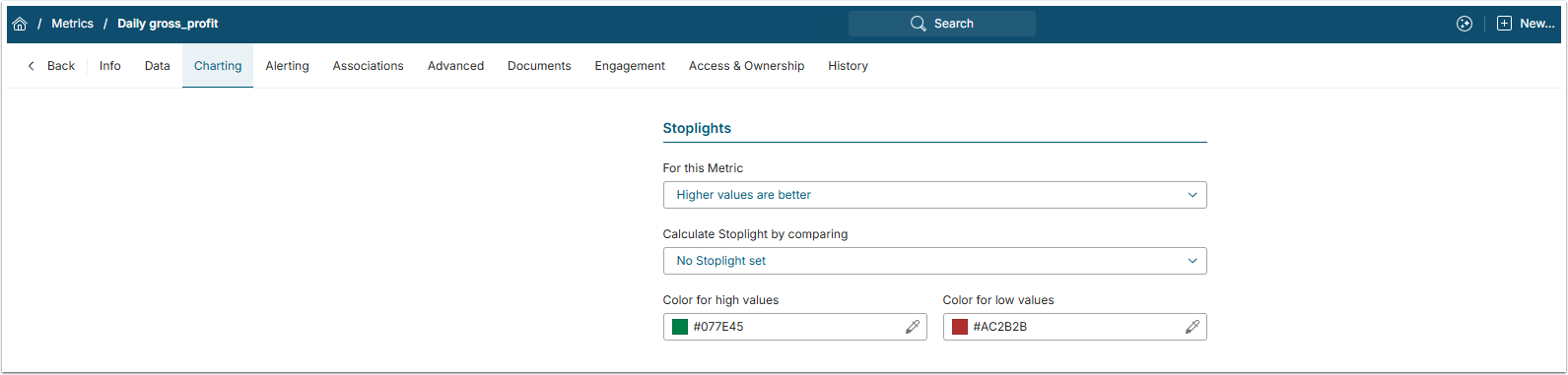 A Stoplight is a visual indicator of how well a Metric is doing. A Metric can have an underperforming, performing, or outperforming depending on the conditions specified in this tab. The result is denoted by different background shading in the various Metric views over time. Stoplight bands are shown even if Metric is represented as a single data point.