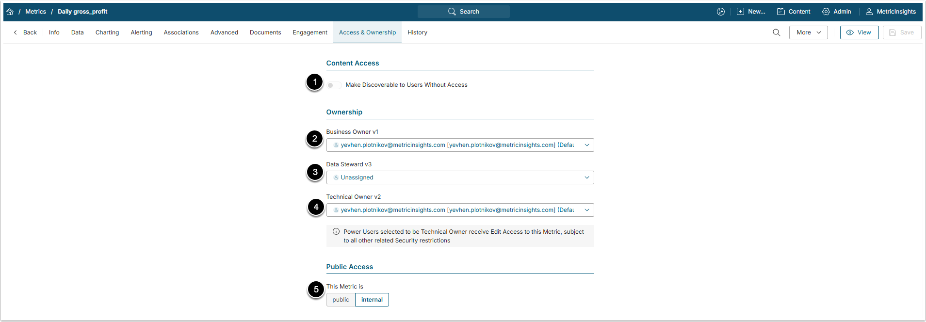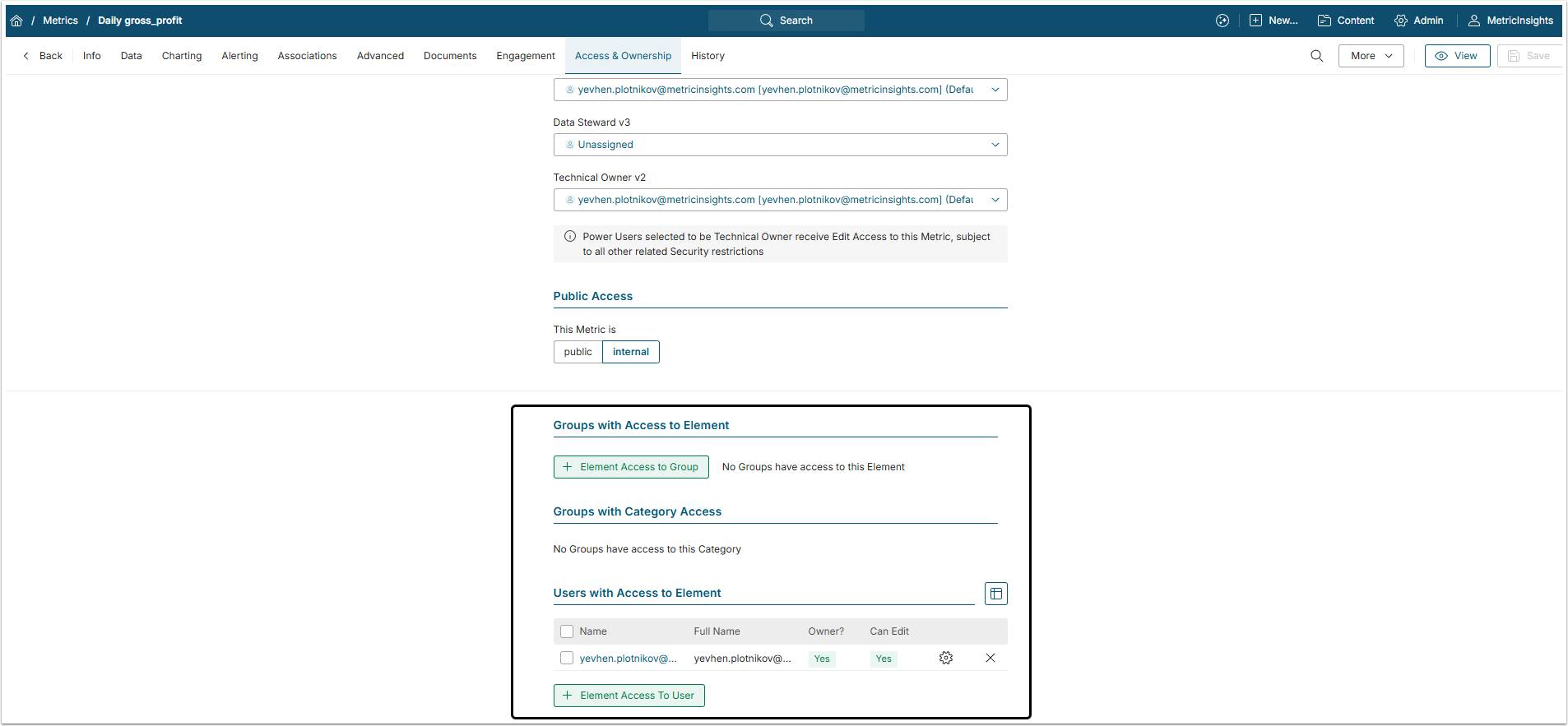 Here the User can define what Groups or separate Users will have access to the Metric. For more details, check the Granting Power User Access to Metric article.