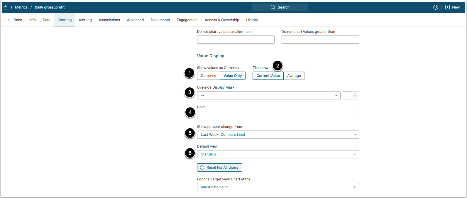 - Visible: Define whether this Metric should be accessible via a tile on a Homepage and searchable through the Search bar.