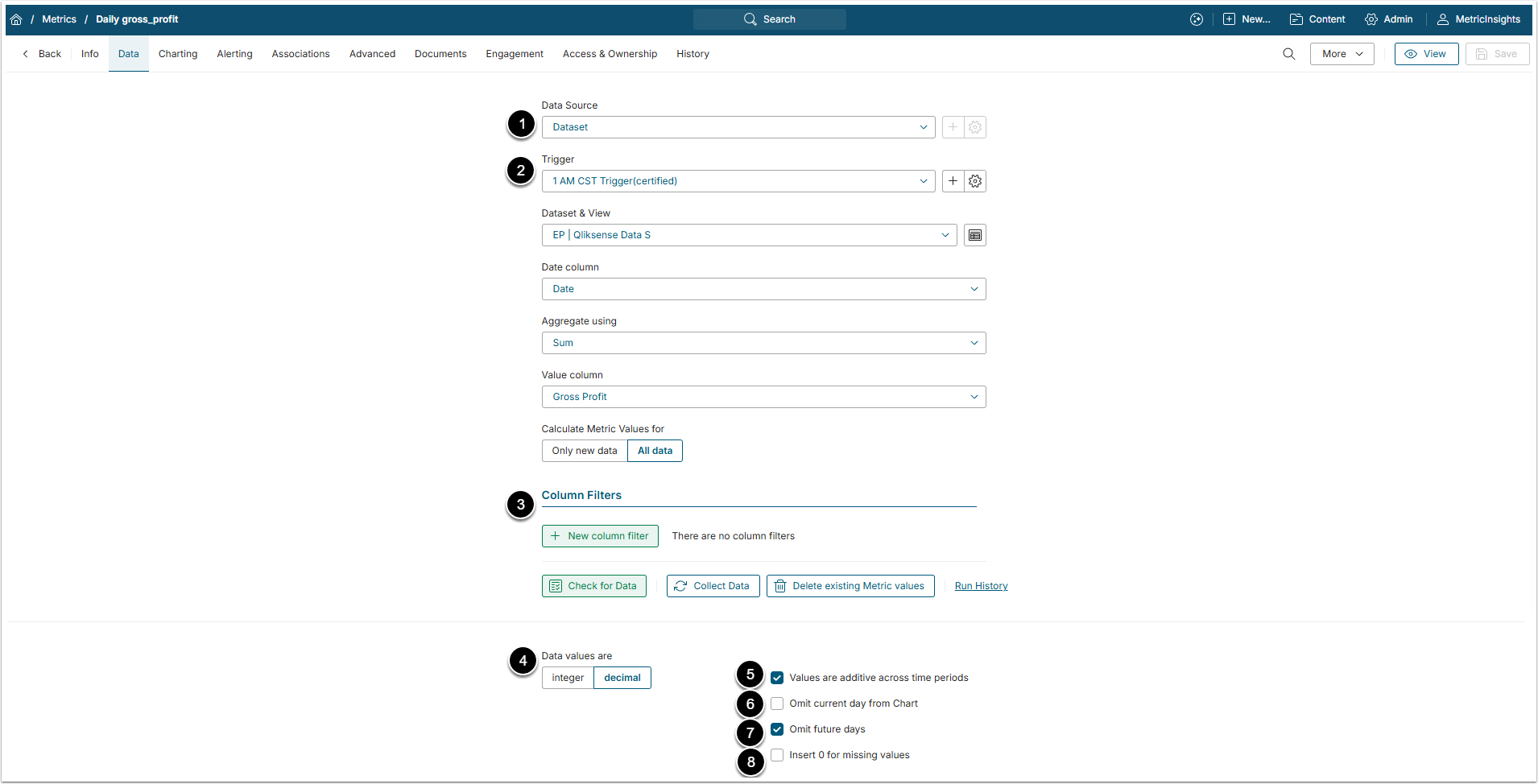 - Collecting is: This setting defines whether this Metric is "active" and whether it is going to be updated upon a schedule set up in a Data > Data Collection Trigger.