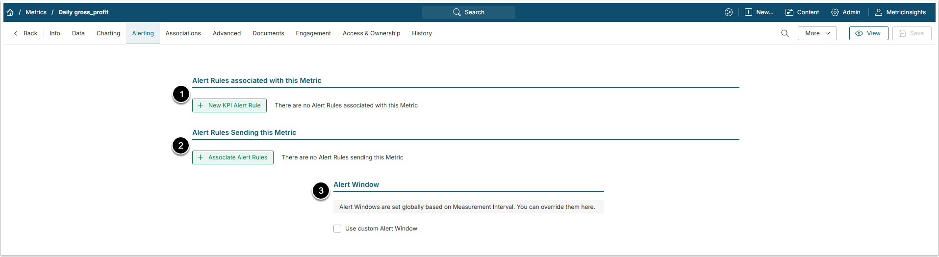 Alert Window:  Determines a time interval after which a Metric value is too old for alert processing.- Use custom Alert Window: This setting will over-ride the default Alert Window from the Measurement Interval. For more details, see Update Measurement Interval Settings.