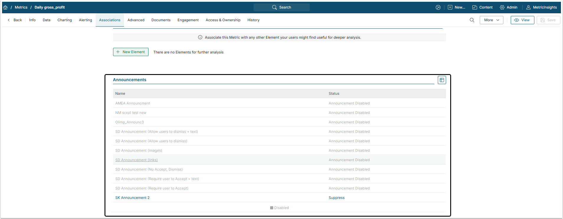 Announcements are used to inform Metric Insights Users of any news, changes, or instructions essential for the seamless company operation. For more details, go through Creating an Announcement on Homepage or Element Viewers article.