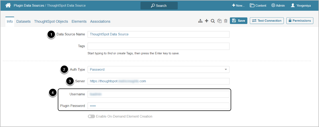 - Enter Username and Plugin Password that you use to log in to the ThoughtSpot server- NOTE: Username and Password are required by the ThoughtSpot API.