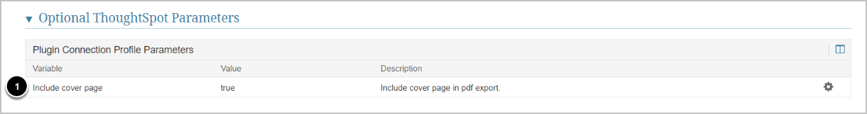 | Include cover page | ThoughtSpot Plugin supports getting native PDFs for External Reports. Enter "true" to include cover page for the PDF. |