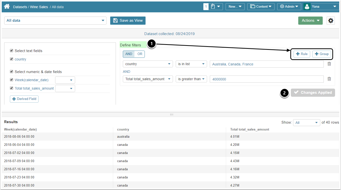 - You can refine your data with Dataset's internal filtering options by applying Rules and Grouping:- For more information on filtering Dataset data, refer to Create a Dataset View