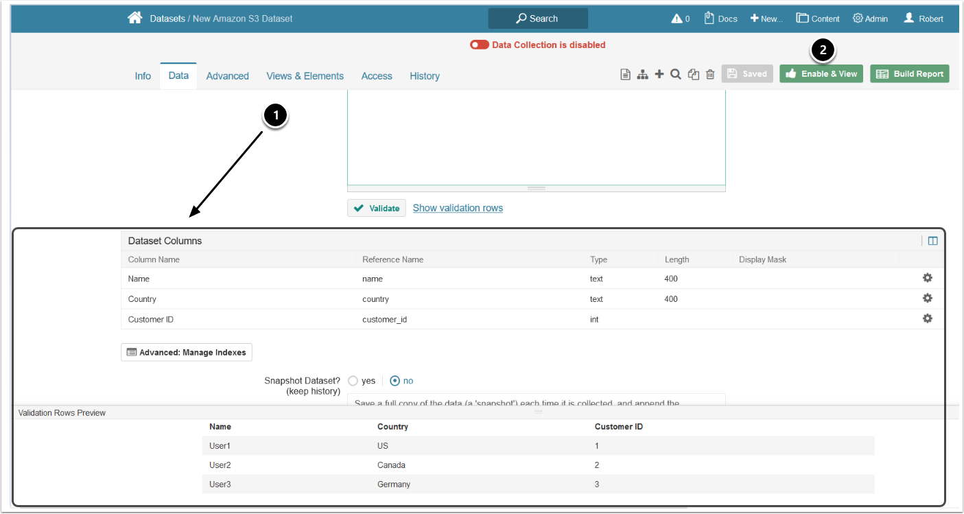 - If the command is validated successfully, the Dataset columns and Validation Rows Preview are displayed below