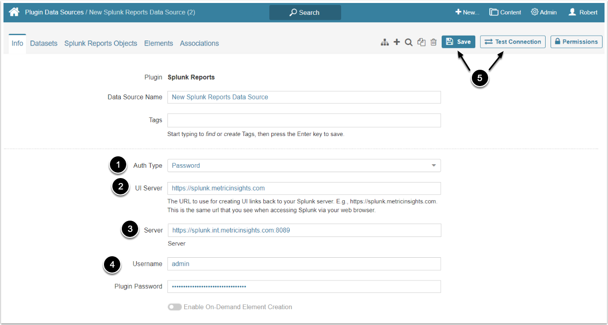 - UI Server: Provide the UI server address to build URLs for the External Reports (the same URL that you see while accessing Splunk via a web browser; e.g., https://splunk.metricinsights.com)