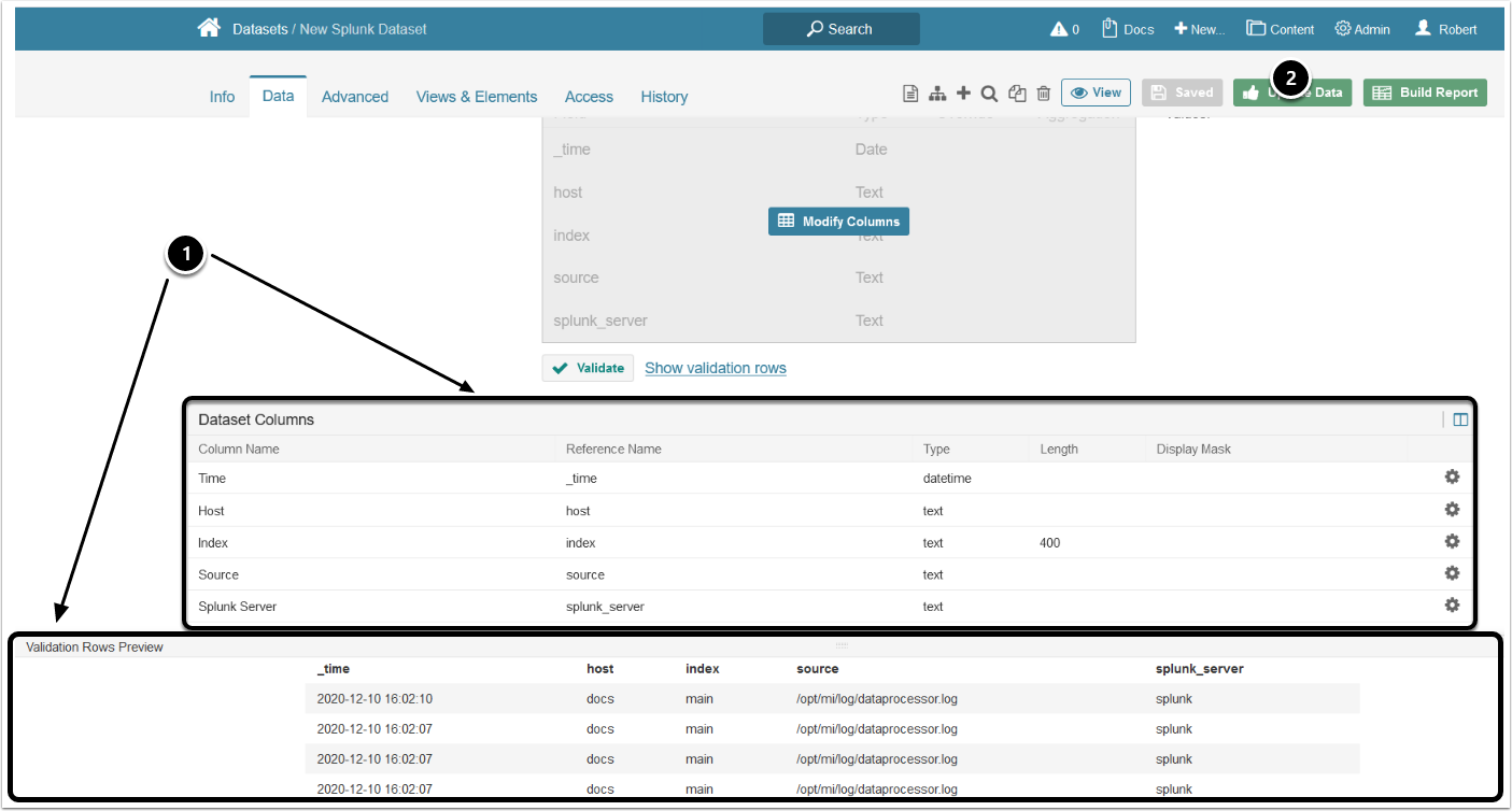 - If the command is validated successfully, the Dataset columns and Validation Rows Preview will be shown below