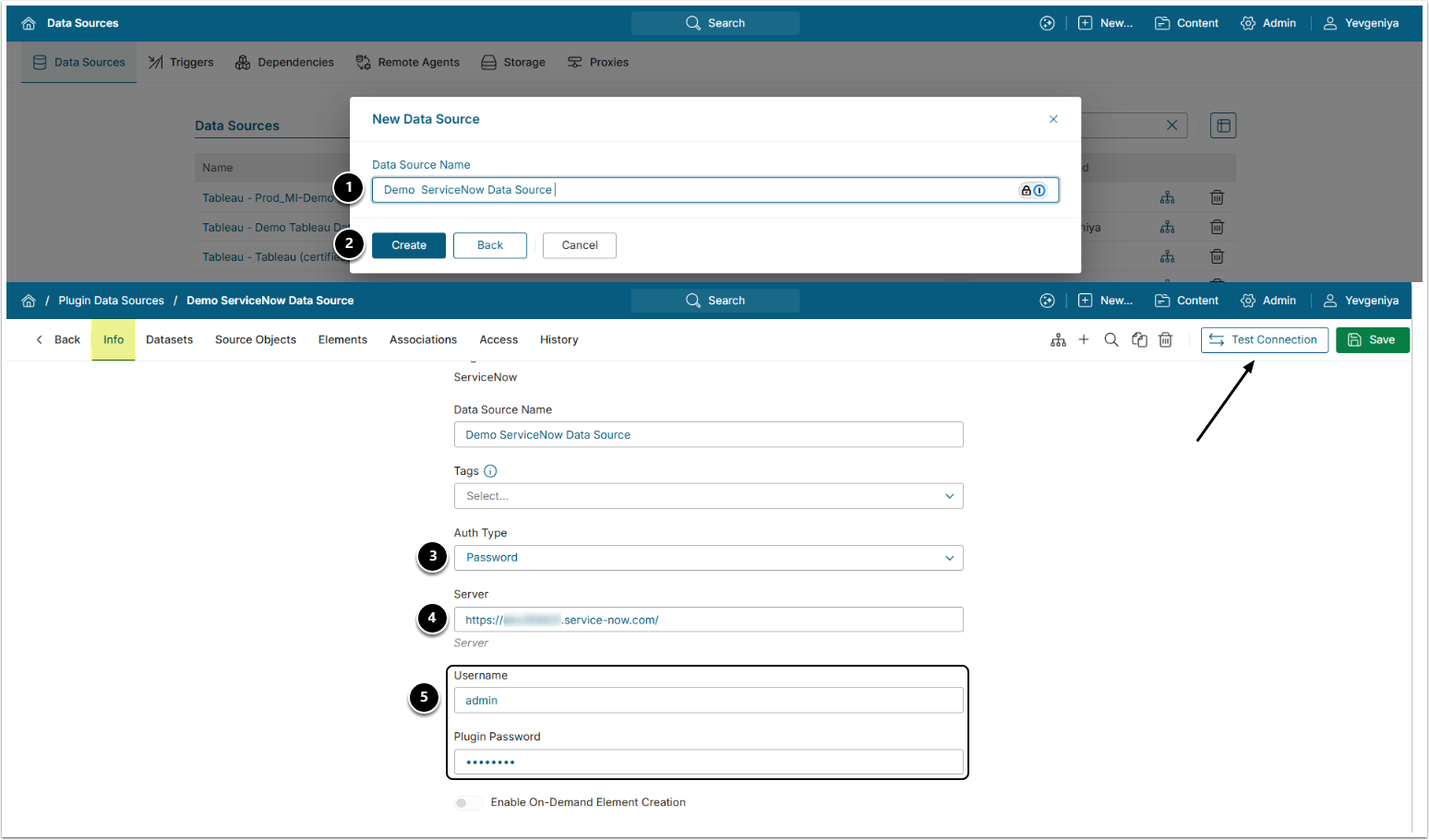 - Username and Plugin Password: provide for the ServiceNow instance's credentials.