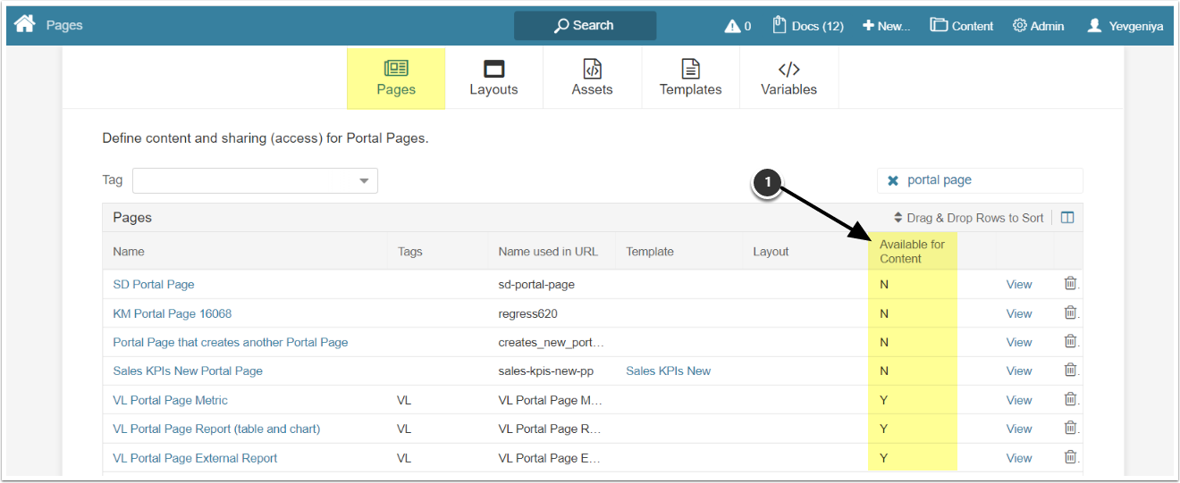 - "Available for Content" column indicates whether or not the Portal Page on the run can be used as a Data Source