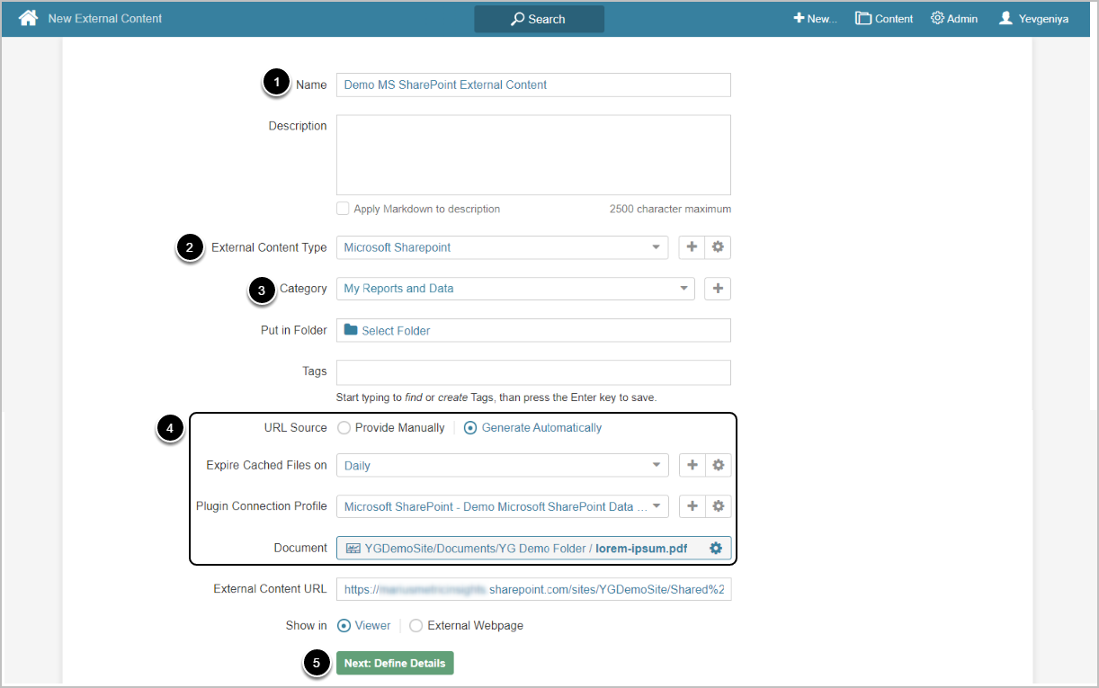 - External Content URL will be filled automatically