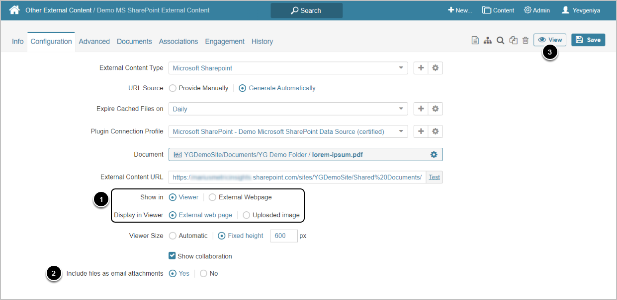 Show in set to "External Webpage" will open content in SharePoint Online as a separate browser window- Show in set to "Viewer" shows options for viewing content in Metric Insights. See the capability matrix below.