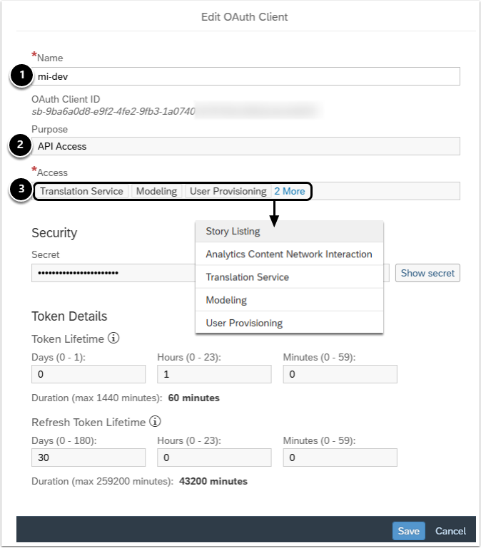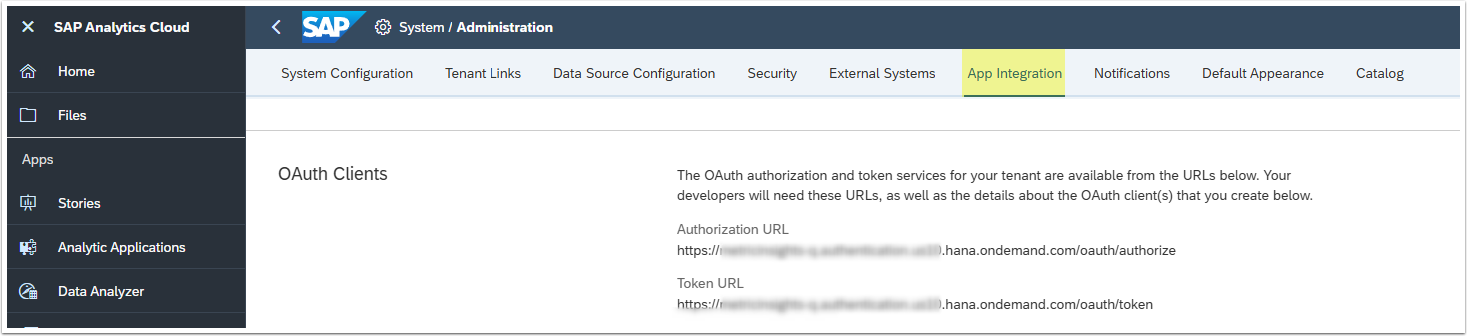 From your organization's SAP HANA Cloud account, access System > Administration > App Integration tab and create a new client, if needed: