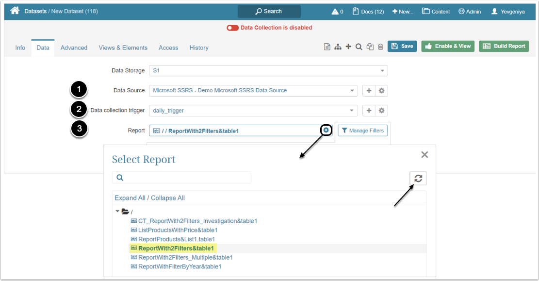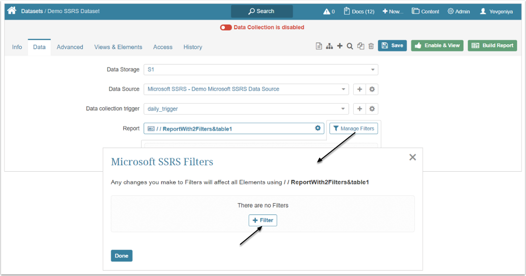 When sourcing data from Microsoft SSRS for Metrics, Reports, External Reports, Dimensions, and Datasets, you can pre-filter your data before fetching it. This function allows to focus on the slice of data that you really need and exclude those values that are currently irrelevant for you and your research.