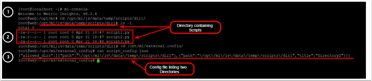 - In /opt/mi/external_config/directory, create ascript_config.jsonfile specifying the path to the directories that contain scripts. Use the following format: