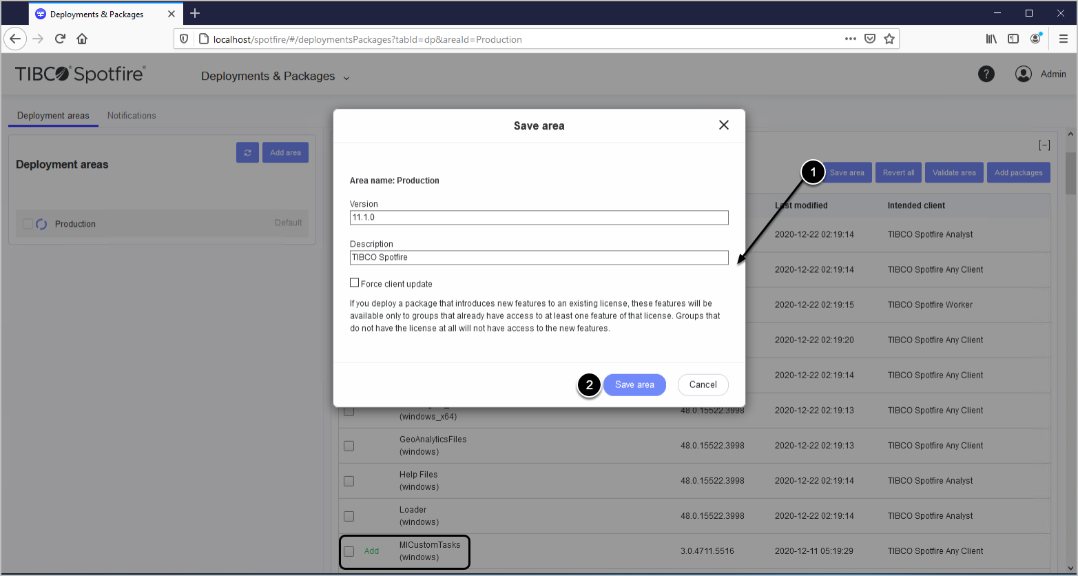 The .spk extension file is uploaded as an MICustomTasks package with the "Add" status