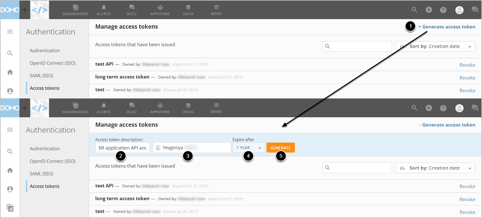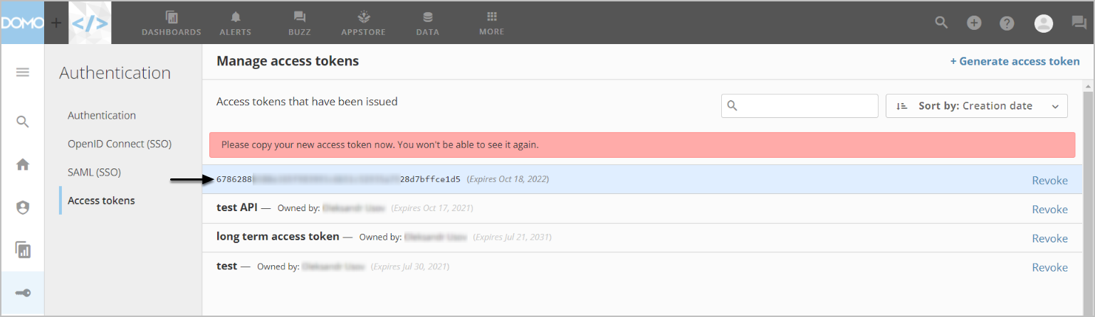 Access https://<hostname>.domo.com/admin/security/accesstokens