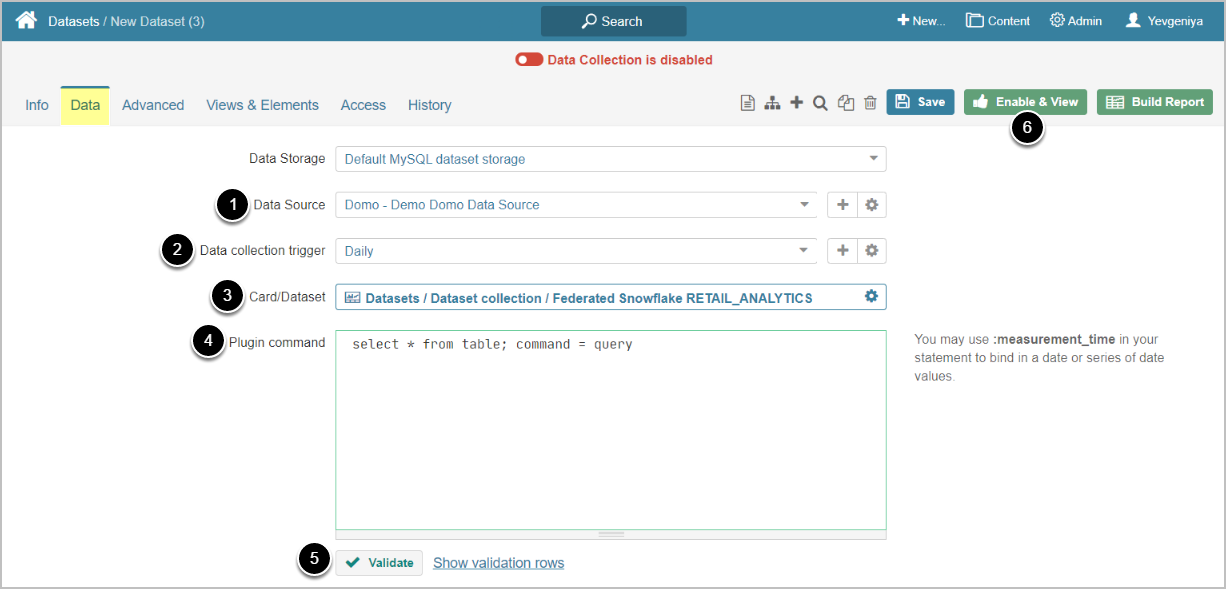 - Input an SQL Plugin Command that selects all the data to be fetched from Domo.- IMPORTANT: Add "command = query" after the SQL Plugin Command. This will help the system properly handle the query.