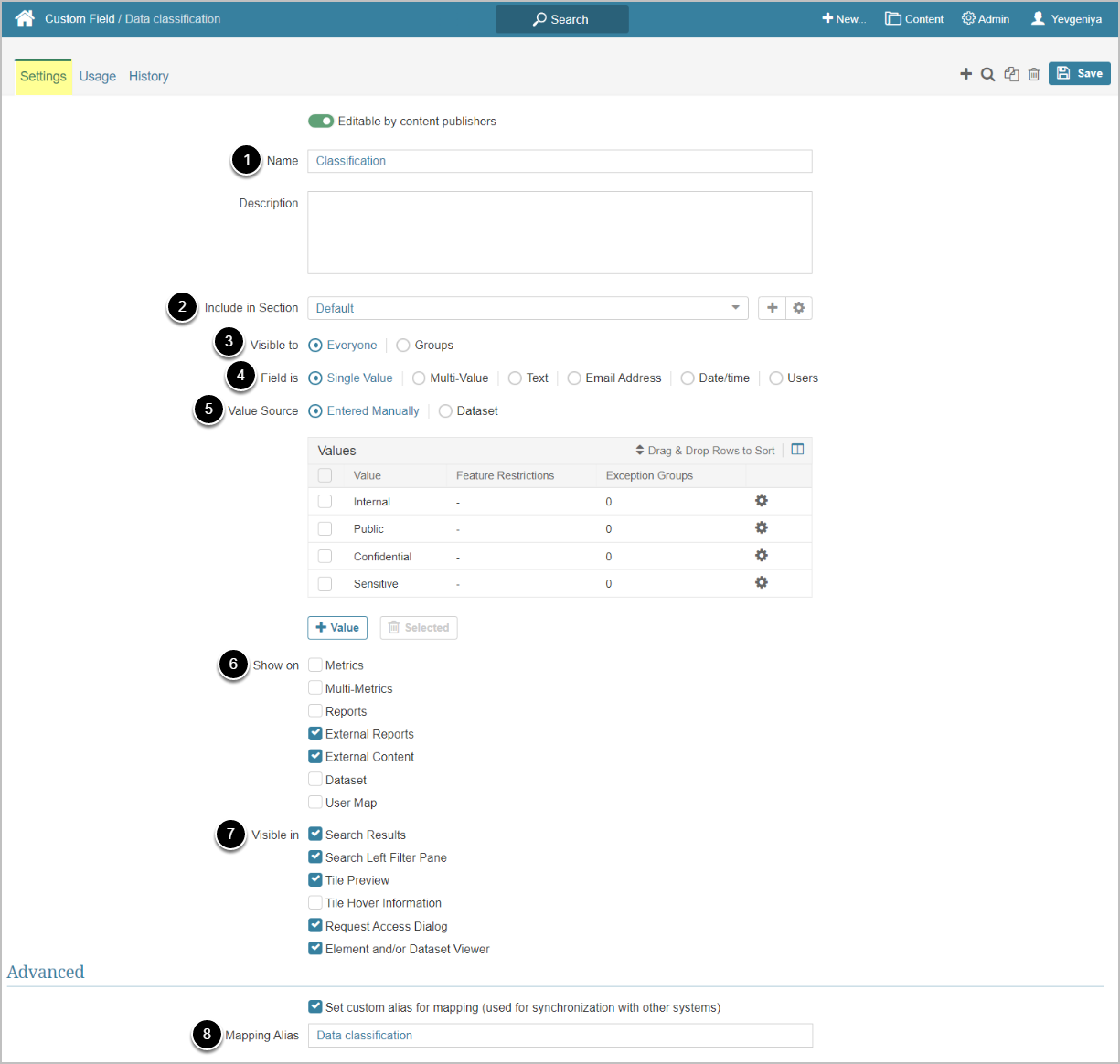 - Input the Custom Field name from Section 2.2 in Mapping Alias. This is the value against which the system will run a check to find corresponding values in SharePoint. - NOTE: This setting is optional; however, we recommend using it to ensure that Custom Field names in MI are exactly the same as in MS SharePoint. If you are not using it, make sure to input Custom Field names from Section 2.2 in the Name field; otherwise, Custom Filed synchronization won't work.