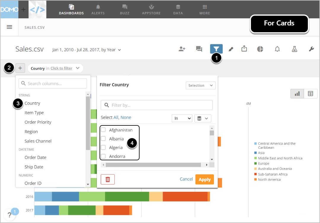 NOTE: Datasets used here must have Values that exactly match the Filter Values in Domo (if the Values do not match, the Filter will not work).