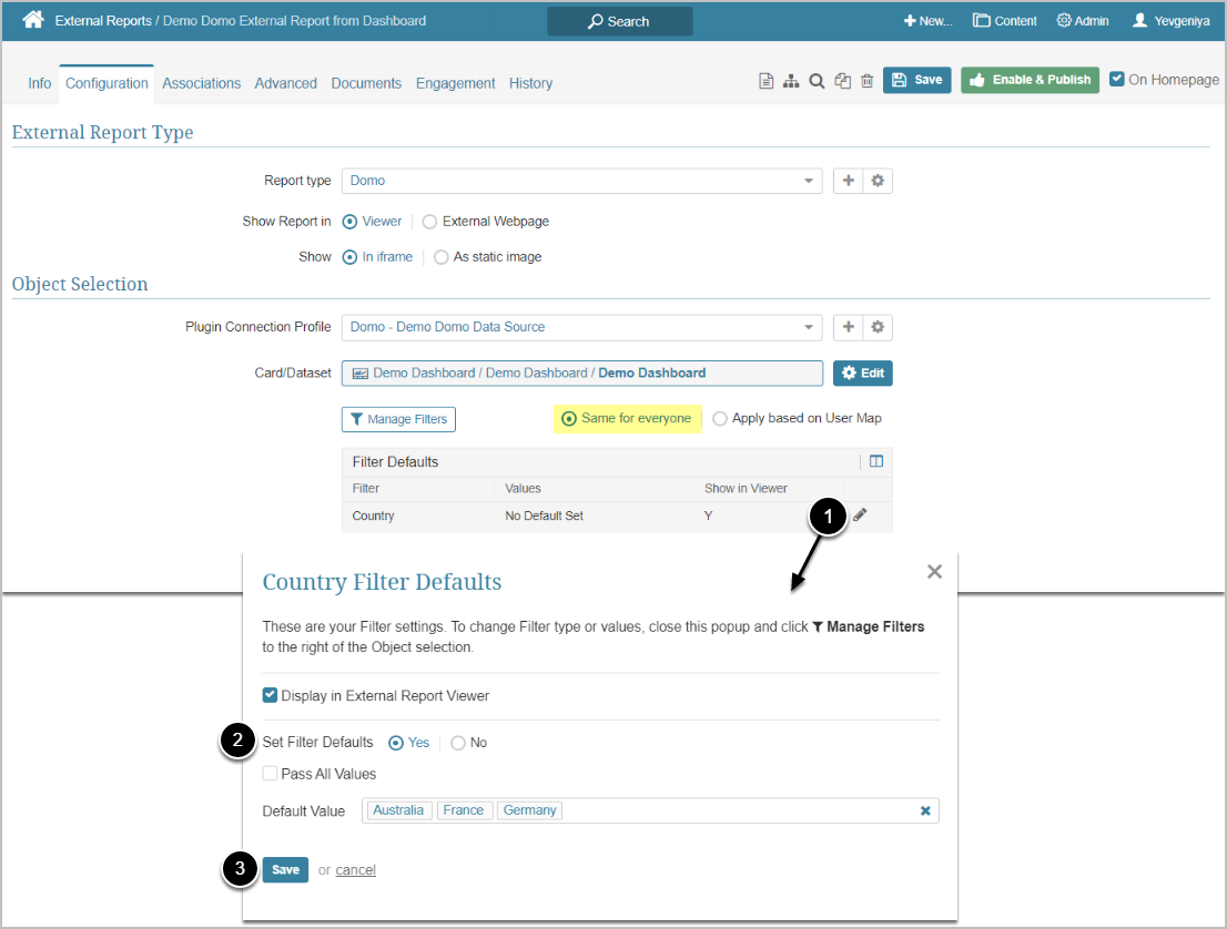 Configuring defaults allows for defining Filter defaults for Users viewing this External Report. Defaults may be set the same for everyone or applied based on a User Map. Consequently, any number of Users will have the correct Filter Values when they open their External Report.