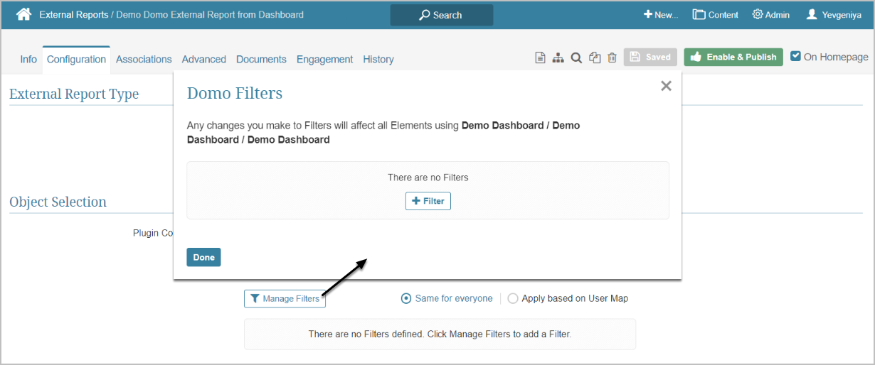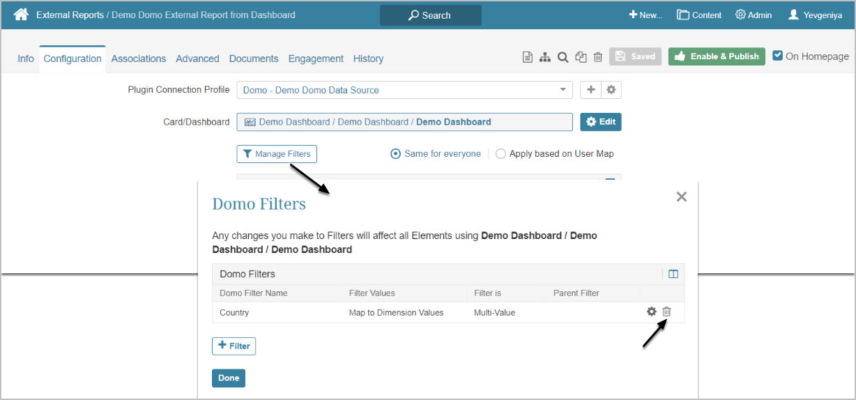 - External filters are tied to Domo objects, not Metric Insights' Elements. This allows Filters to be reused for multiple Elements (without creating new Filters every time an Element is created in Metric Insights).